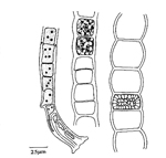 Cells in the upper parts of filaments, barrel-shaped cylindrical 0.4-1